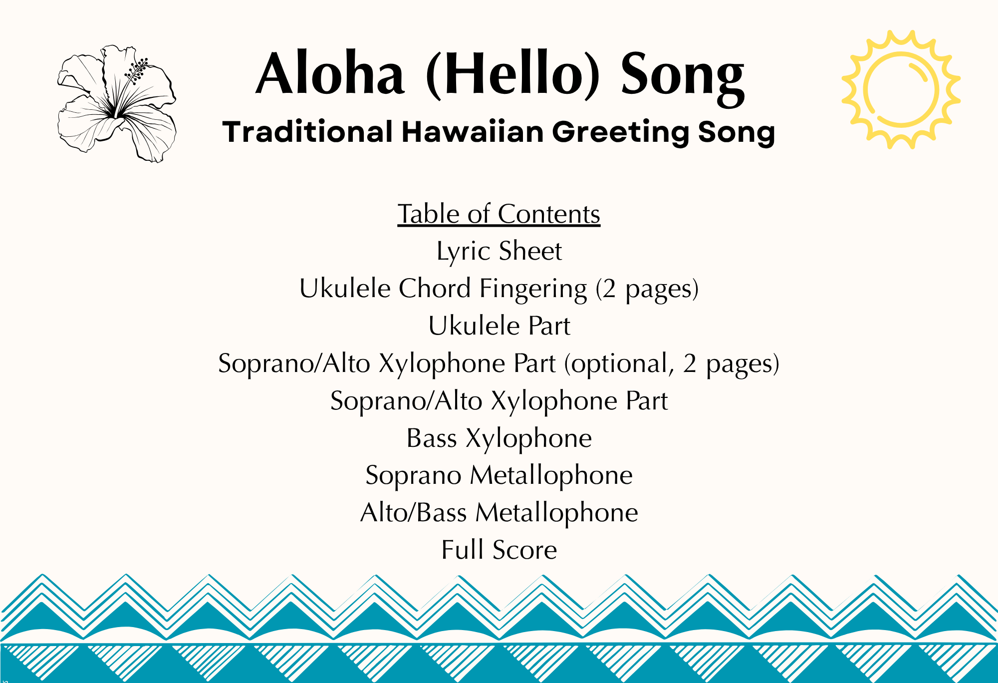 The ‘Aloha (Hello) Song’ is a traditional Hawaiian song adapted for the classroom, incorporating Hawaiian greetings for different times of day — kakahiaka (morning), awakea (midday), ‘auinalā (afternoon), and ahiahī (evening). This resource features ukulele and xylophone parts to create a rich instrumental accompaniment, giving students the opportunity to explore Hawaiian language and culture through music. With accessible arrangements and engaging parts, it’s a wonderful way to introduce students to world music, cultural appreciation, and ensemble playing. (Click for Link to TPT)